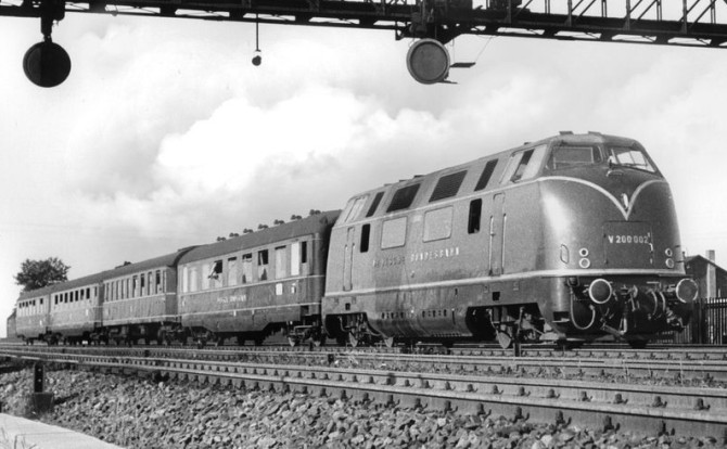 Die V200 002 mit einem Schnellzug im Jahr 1958. Copyright: Helmut Röth / Slg. Eisenbahnstiftung